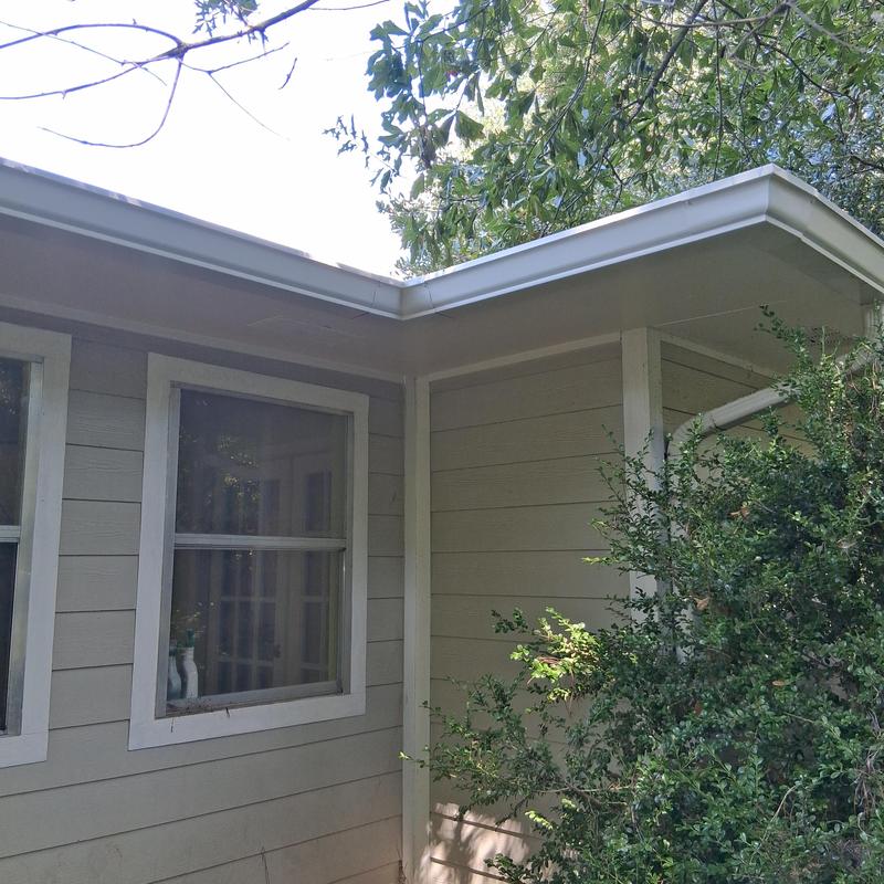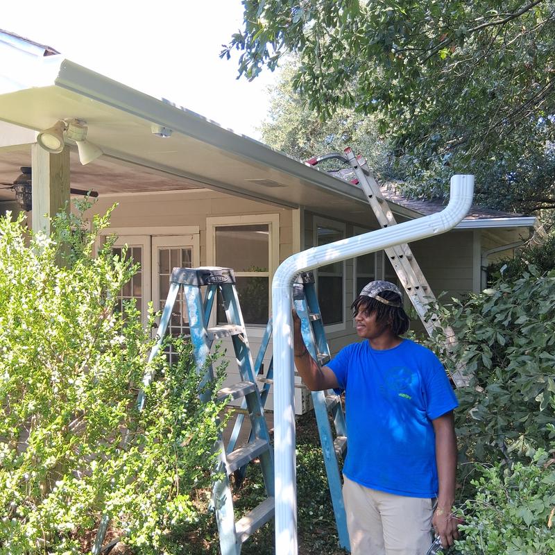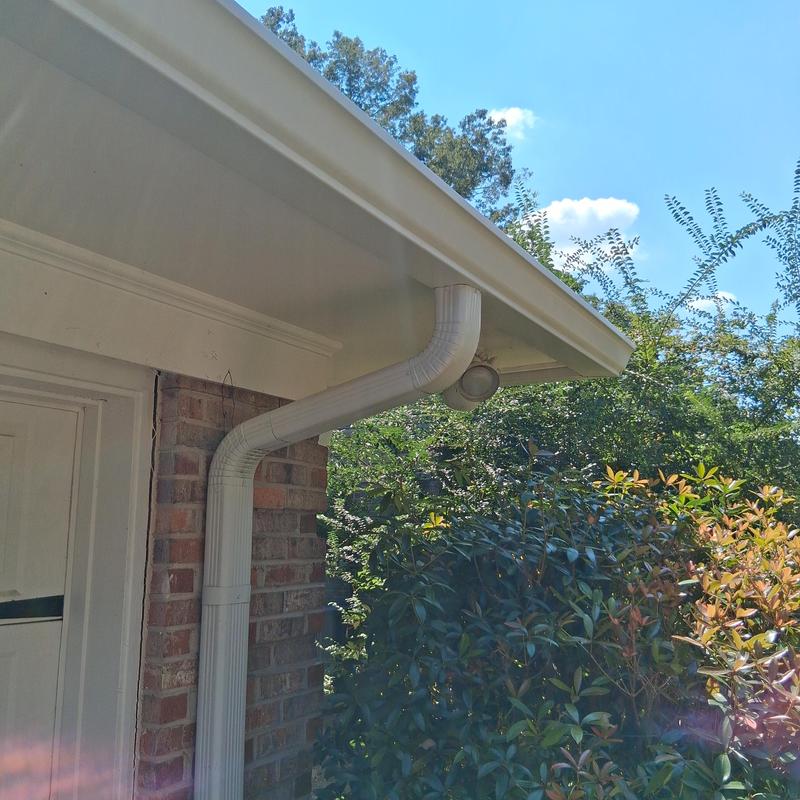 Contractors in Clinton, Mississippi removed damaged soffit, fascia boards, and gutters. They installed new soffit, bolted fascia, attached new gutters, applied caulk, and completed painting.