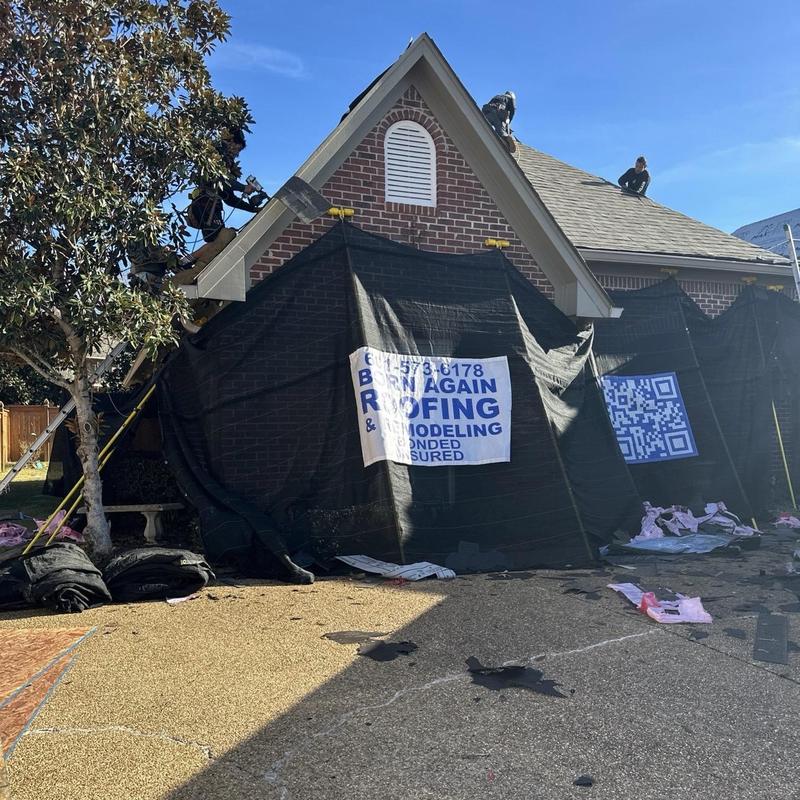 BORN AGAIN HOME REMODELING AND ROOFING LLC replaced a damaged roof in Jackson, Mississippi. The team removed the old roofing, inspected and repaired decking, installed new synthetic felt, applied GAF HDZ architectural shingles, and cleaned up debris using magnets to clear the yard.