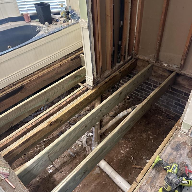 Contractors installed floor joists and added blocking for a bathroom remodel in Jackson, Mississippi. This structural work supports future plumbing and flooring upgrades, ensuring stable and level surfaces for ongoing renovation tasks.