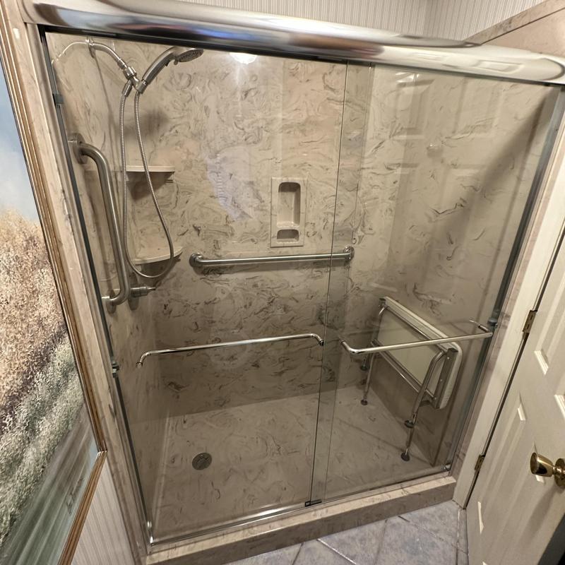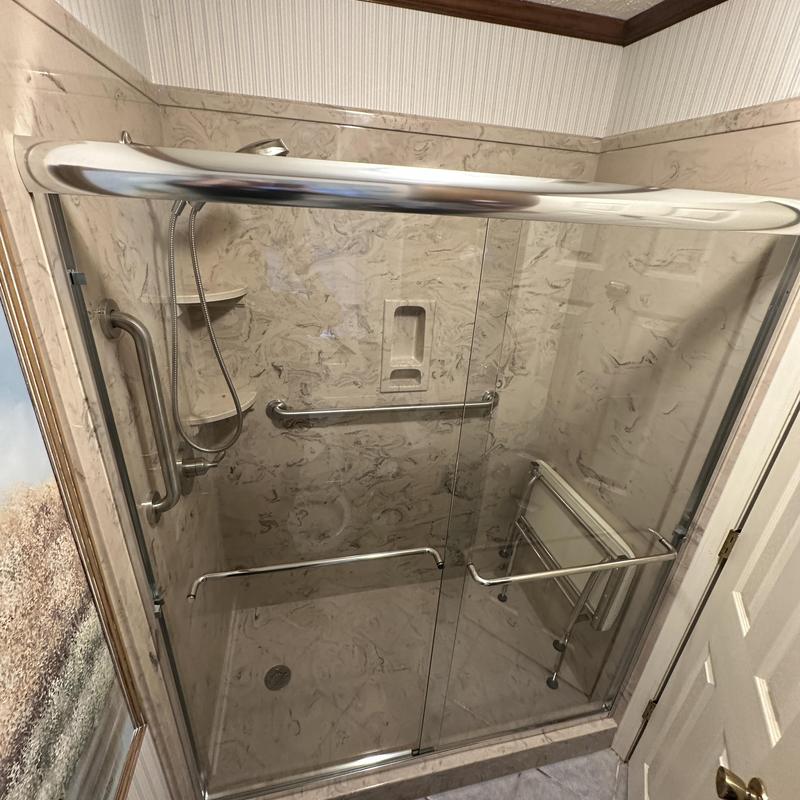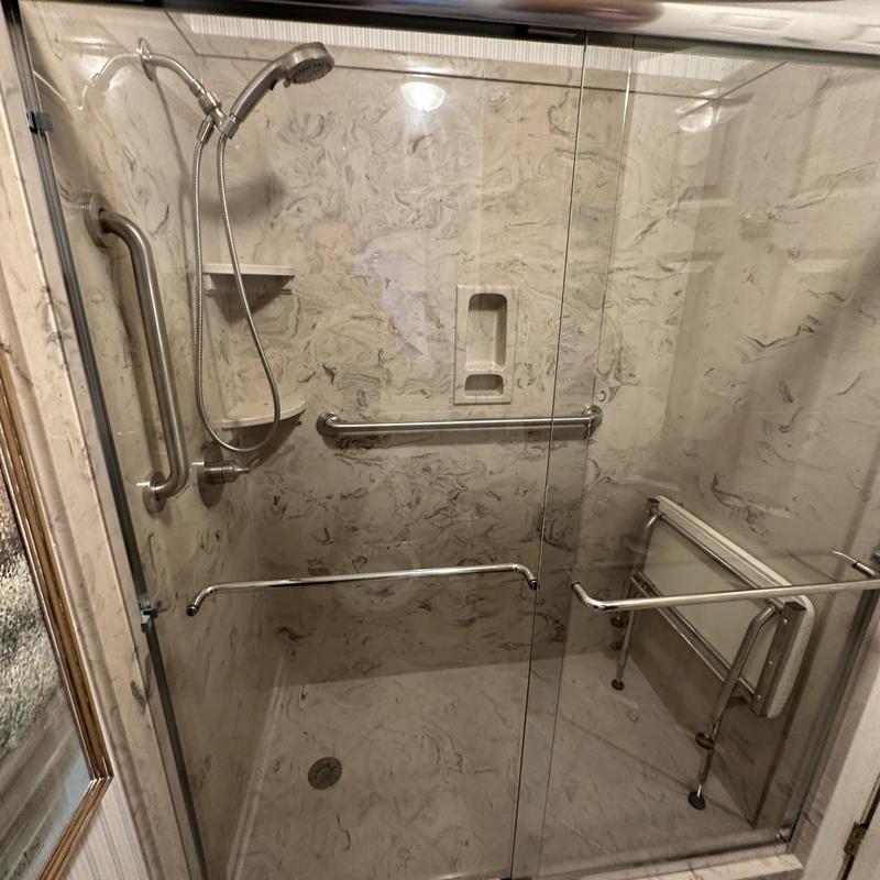 BORN AGAIN HOME REMODELING AND ROOFING LLC removed an existing bathtub and shower wall in Pearl, Mississippi. The team installed a new valve and drain system, set a grout-free shower unit, fitted a custom shower door, and added an ADA-compliant seat to improve function and accessibility.