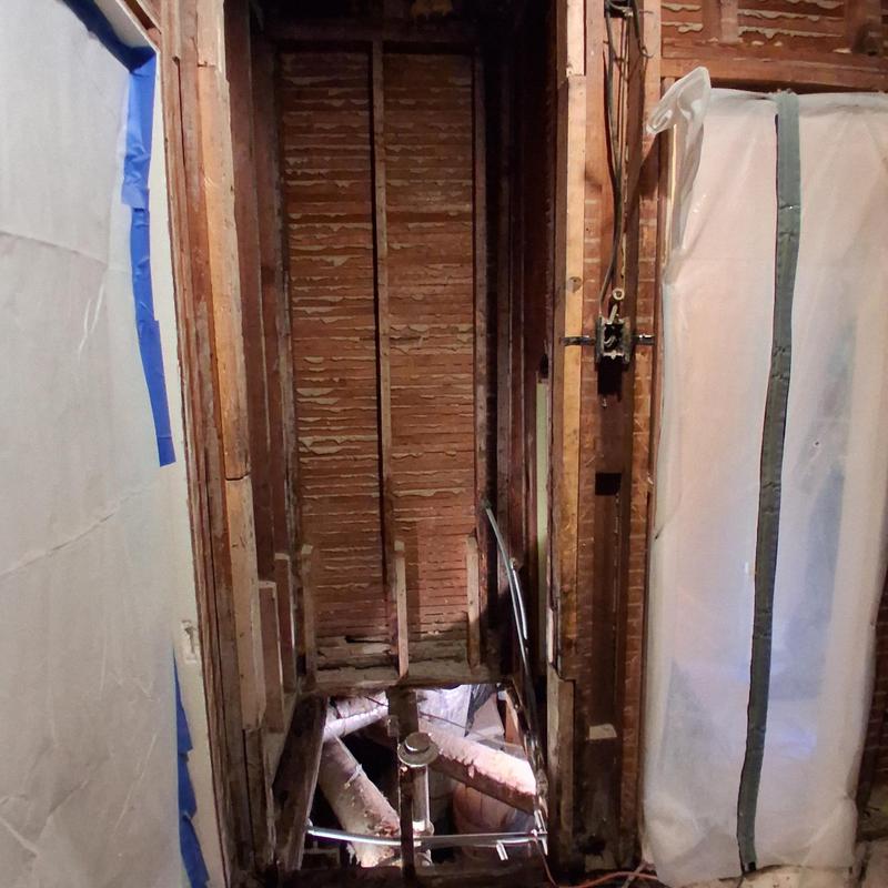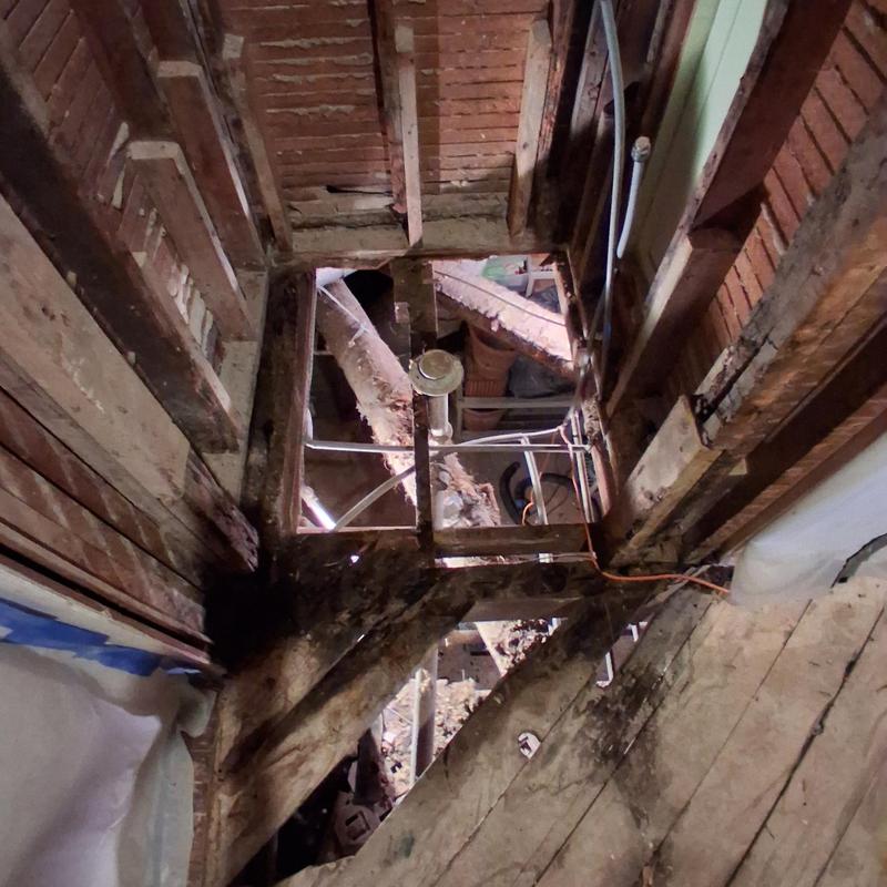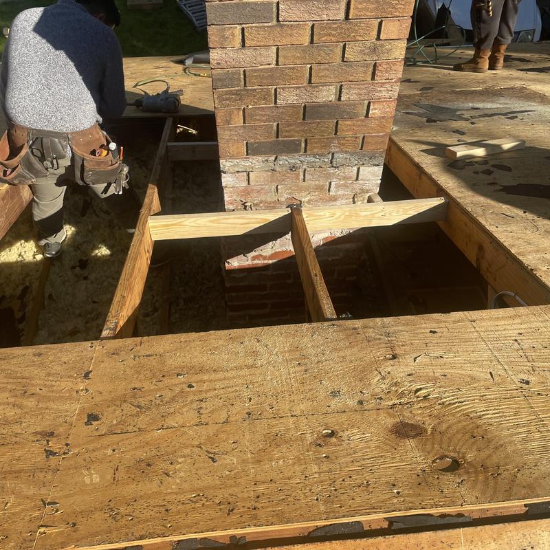 Contractors removed an existing chimney as part of a demolition project in an unspecified location. This work involved dismantling structural components and clearing debris to prepare the area for further renovation or construction.