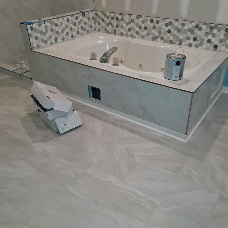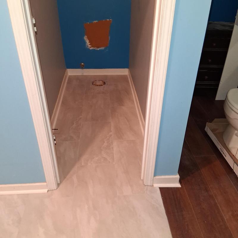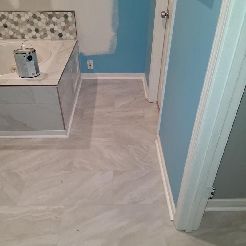 A contractor installed baseboard and shoe molding to support a flooring tile job as part of a bathroom remodel in Jackson, Mississippi. This trim installation ensures a clean transition between the floor and wall, completing the tile work with a secure and functional finish.