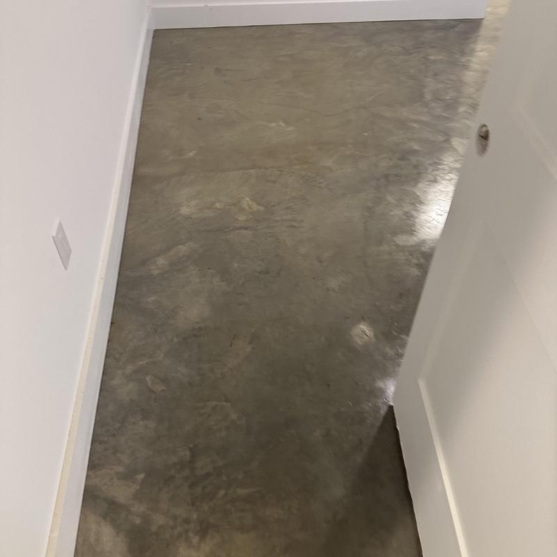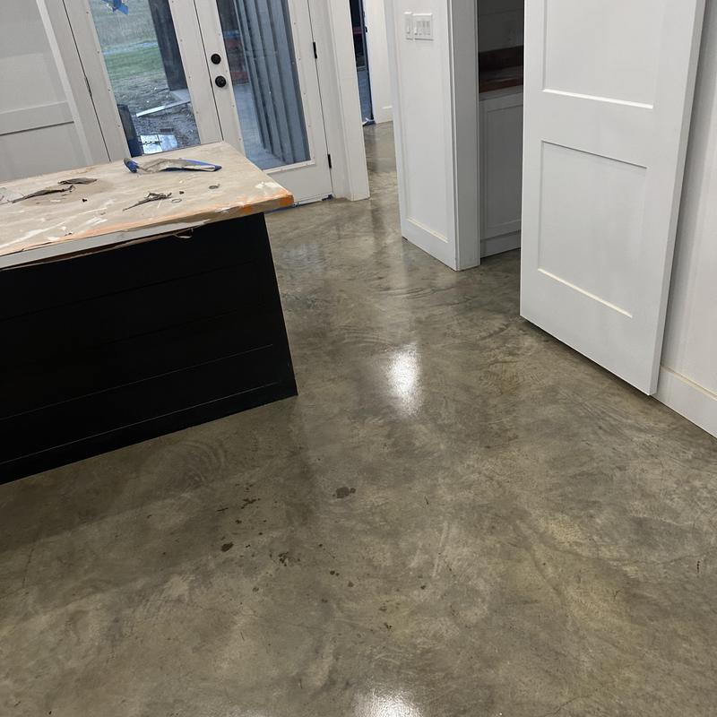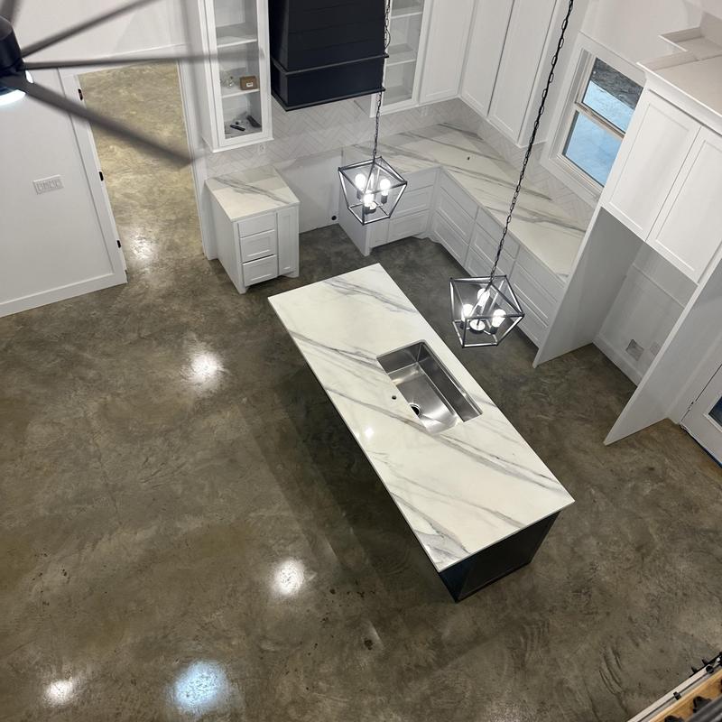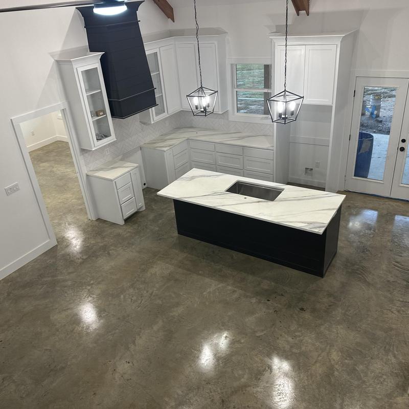 Contractors in Jackson, Mississippi completed an interior renovation. They removed walls, flooring, and plumbing. They built new walls, installed custom cabinets, mounted new fixtures and countertops, and painted walls and cabinets. They also polished and sealed the concrete floor, creating a clean and updated surface throughout the space.