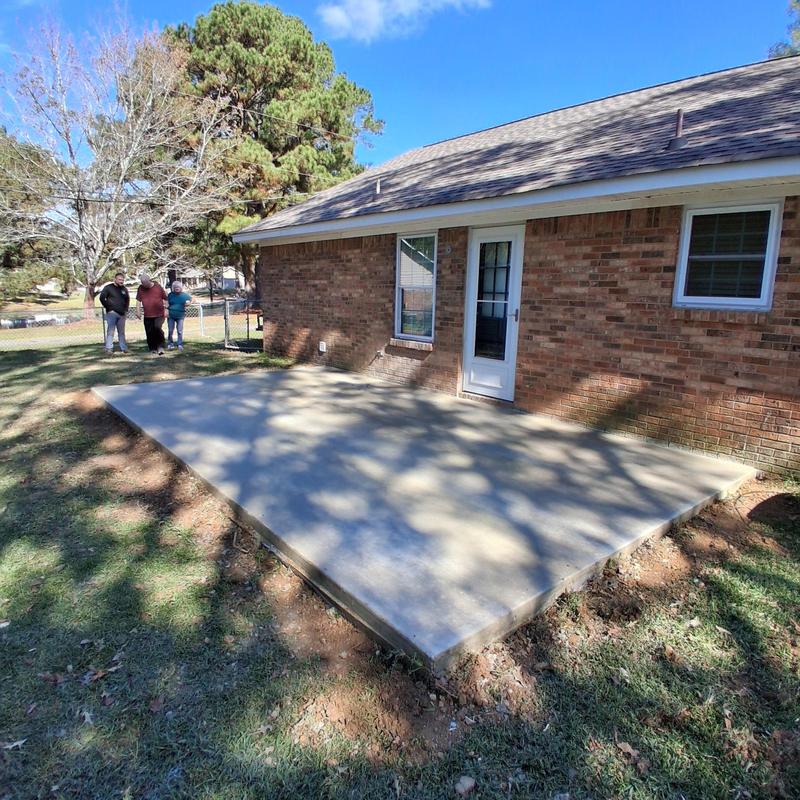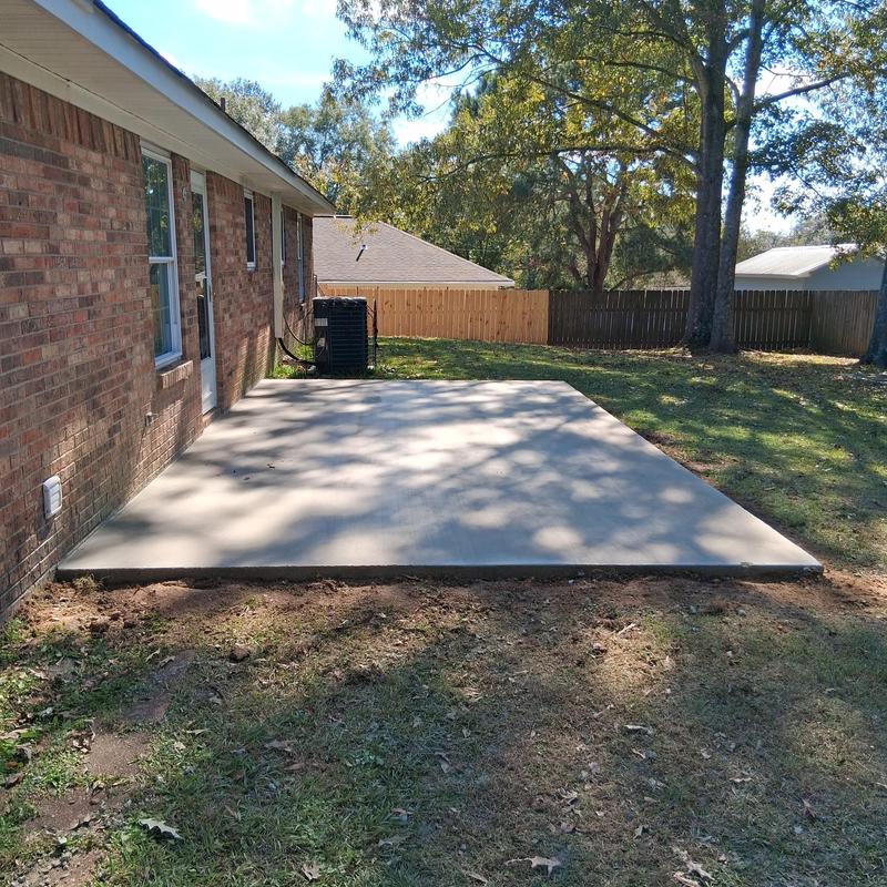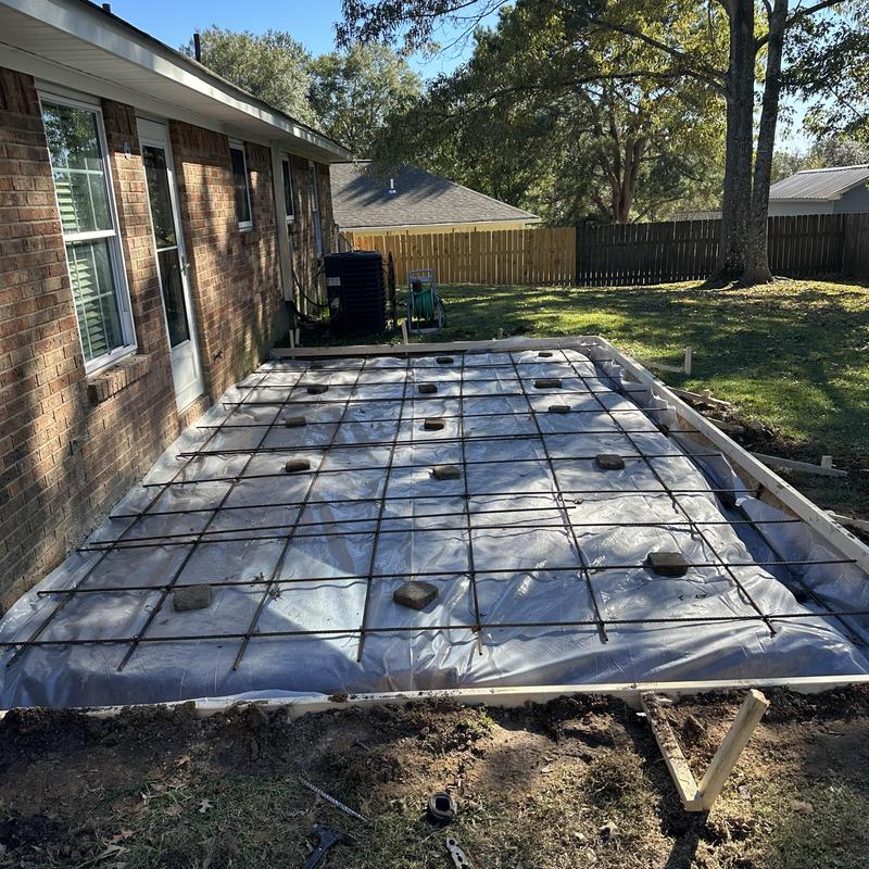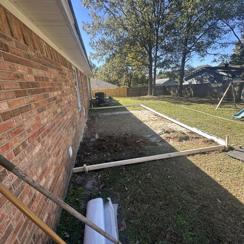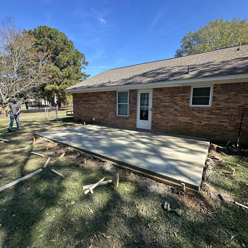 Contractors formed a concrete pad for a back patio in Pearl, Mississippi. This work involved preparing the area and setting forms to shape and support the concrete during pouring and curing. The project added a durable surface fit for outdoor use.