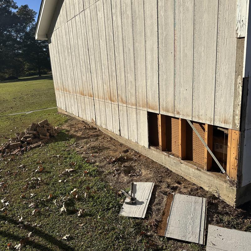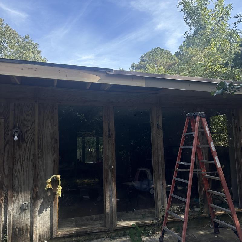 Born Again Home Remodeling and Roofing LLC repaired rotten wood during a shed demolition in Clinton, Mississippi. The team replaced damaged structural components to improve the shed's stability before completing the removal process.