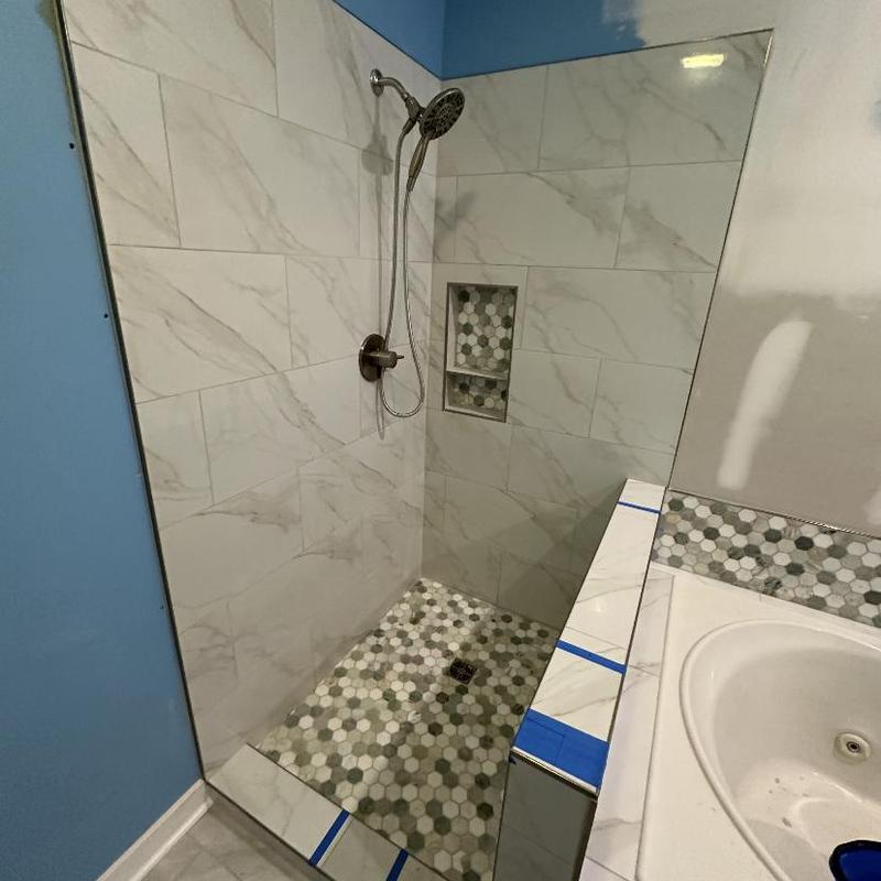 BORN AGAIN HOME REMODELING AND ROOFING LLC completed a shower renovation in Jackson, Mississippi. The team removed the old unit, installed a new valve and drain, set a mud bed with vinyl liner, added Hardy Backer board, applied waterproofing, set tile, and installed a custom door with a glass panel.