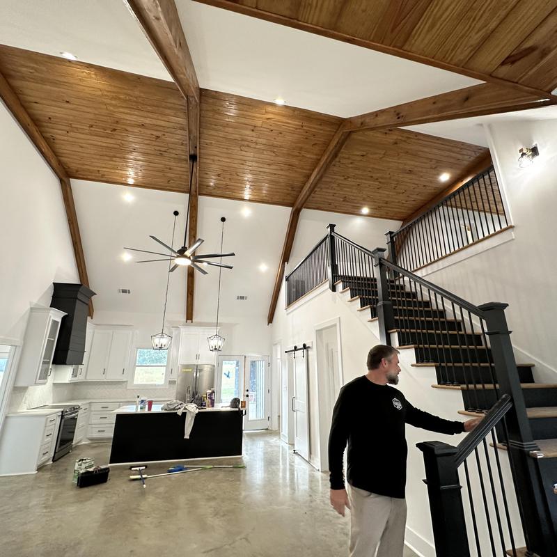 BORN AGAIN HOME REMODELING AND ROOFING LLC built custom built-in cabinets for dorm rooms and wrapped structural beams with cypress wood in Clinton, Mississippi. This project improved interior storage and updated exposed framing with natural wood finishes.
