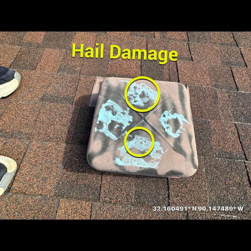 A contractor completed a roof inspection in Pflugerville, Texas, and identified hail damage affecting the shingles and soft metal components.