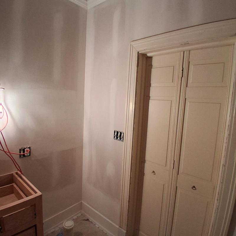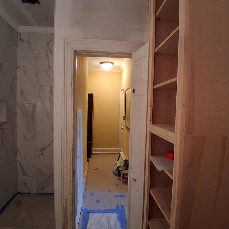 BORN AGAIN HOME REMODELING AND ROOFING LLC installed crown molding, baseboards, and shoe molding, refitted door trim, reset doors, applied caulk, and built custom cabinets. This interior carpentry project improved trim detail and door function in an existing structure. Location data was not provided.