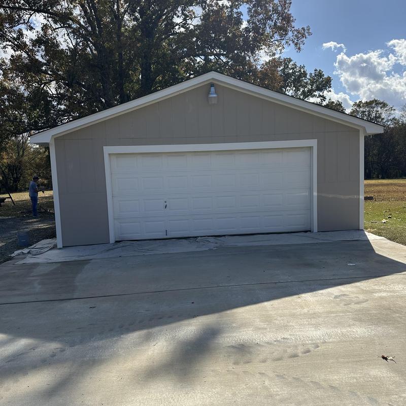 Contractors installed new siding on a garage in Clinton, Mississippi. The project involved replacing exterior wall panels to improve durability and weather resistance. This service helps maintain the garage structure and protects it from moisture and temperature changes.